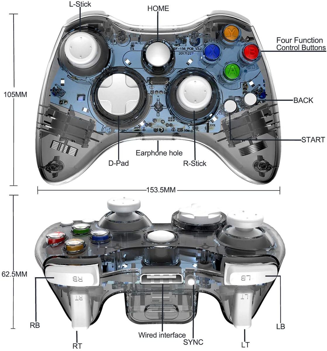 Joystick: Asymmetrical analog stick design , 360°omnidirectional accurate operation, concave left stick and convex right stick prevent slipping.