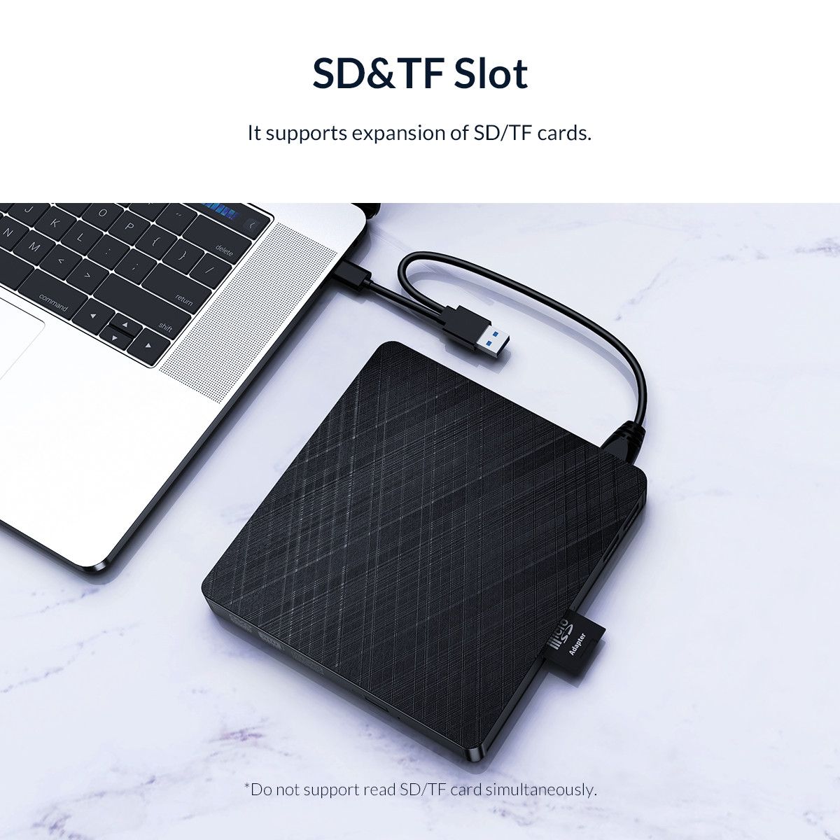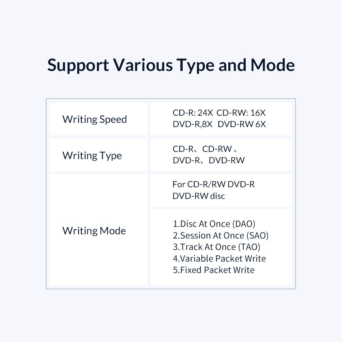 7. Supported reading types: DVD ROM (single layer), DVD ROM (double layer), DVD+R/DVD-R, DVD+R DL/DVD-R DL, DVD+RW/DVD-RW, DVD RAM, CD ROM/ finalized CD RW, Data/CD-DAE, Video CD, finalized CD RW. Unfinalized CD-R/RW, TF card SD card