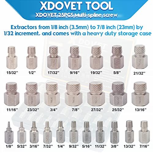 - 25 ps bolt extrator set&multi-appliation Extrators from 1/8 inh (3.5mm) to 7/8 inh (23mm) by 1/32 inrement and omes with a heavy-duty storage ase.Extrator set an be used to remove broken studs, bolts, hexagon soket srews and fittings, or it an be used with a hexagonal drill bit for a wider range of appliations.