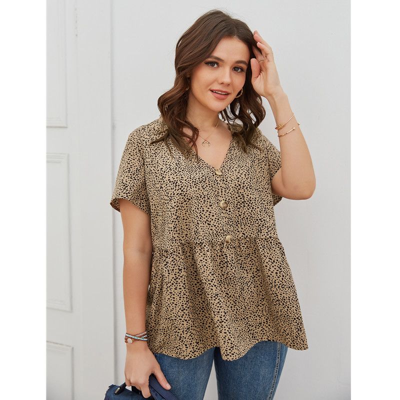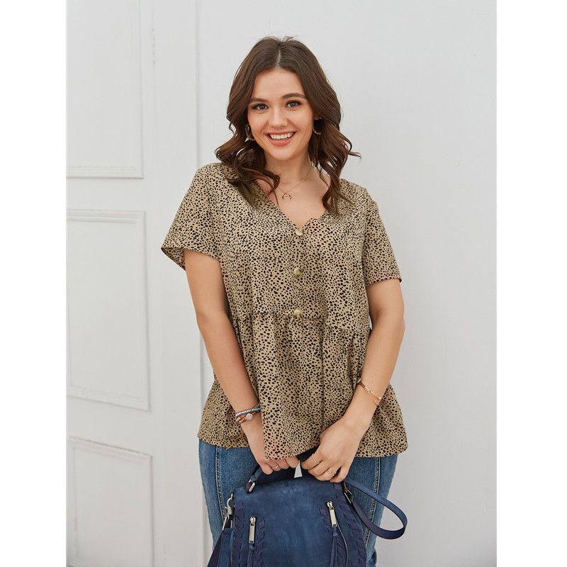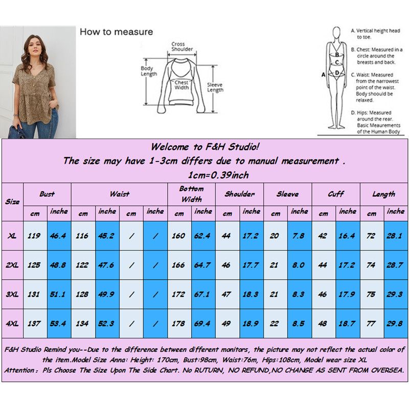 Color: Khaki Size: XL, 2XL, 3XL, 4XL Model Size FYR: Height: 171cm, Bust:106cm, Waist:76cm, Hips:120cm, Model wear size XL ❤This is a v neck short sleeve big size tops plus size blouse !!❤Style:V Neck Sgort Sleeve Plus Size Blouse Big Size Tops. Please note that slight color difference should be acceptable due to the light and screen.What You Get:1 x Blouse. FQA:1. Q: Why the item haven't shipped out? A: After you place the order, We will ship the item to the rehmie warehouse within 48 hours as soon as possible, and then rehmie warehouse will send the item to you. If you find the logistics status is"to be shipped", it may be because the rehmie warehouse has not yet been shipped. Please don't worry. 2. Q: How can I choose the size? A:Please refer to the size chart and select the appropriate size according to your actual size.If you are not sure what size to choose, please call me. 3. Pls take note that all the clothes can not be returned or exchanged.4. All dimensions are measured by hand, there will be 2-3cm reasonable deviations. (1cm=0.39 inches). Pictures are only samples for reference. Due to the differences in monitor settings, the colors shown in the photograph may not correspond 100% to those in the items themselves. 5.For transportation needs, the cloth that you've received will have a fold phenomenon. Please don't worry, this fold situation will disappear after the first time you clear or ironing.