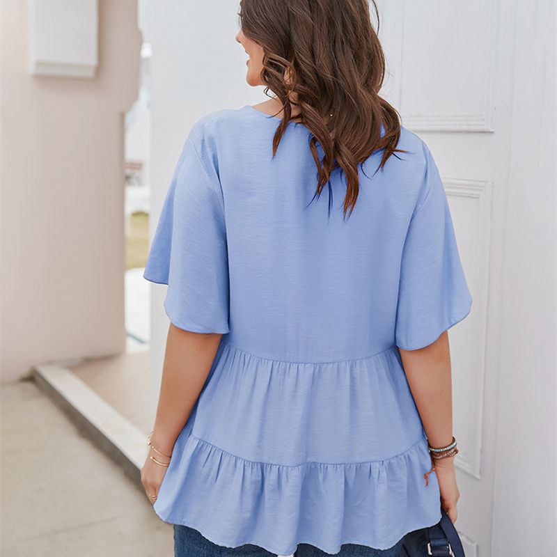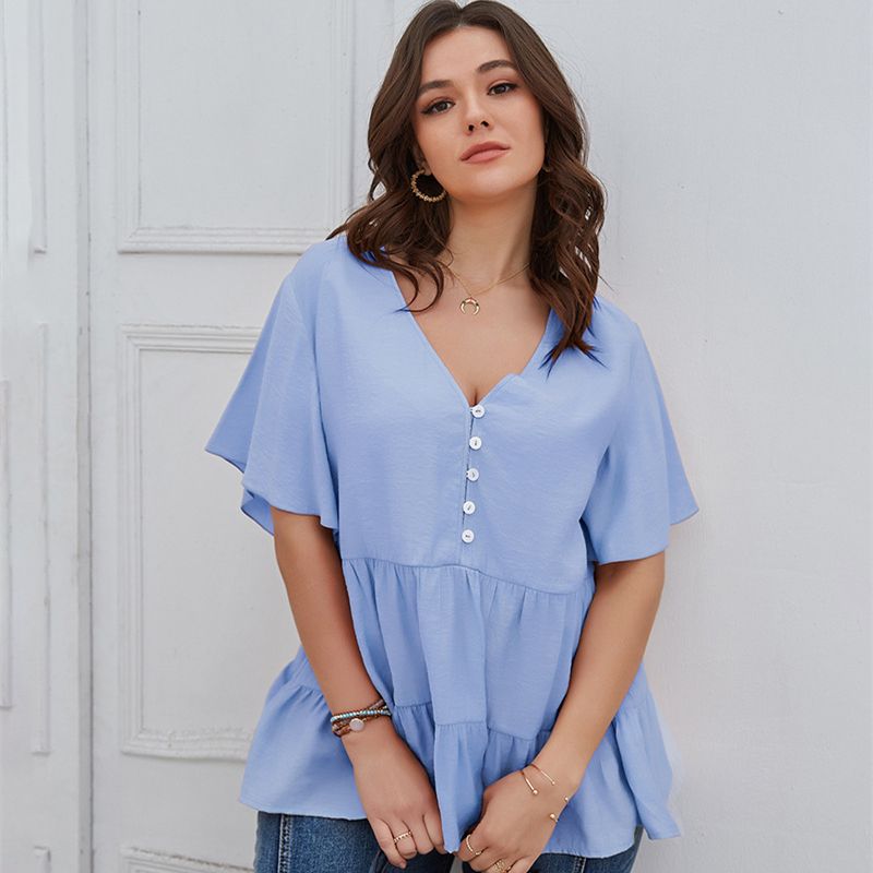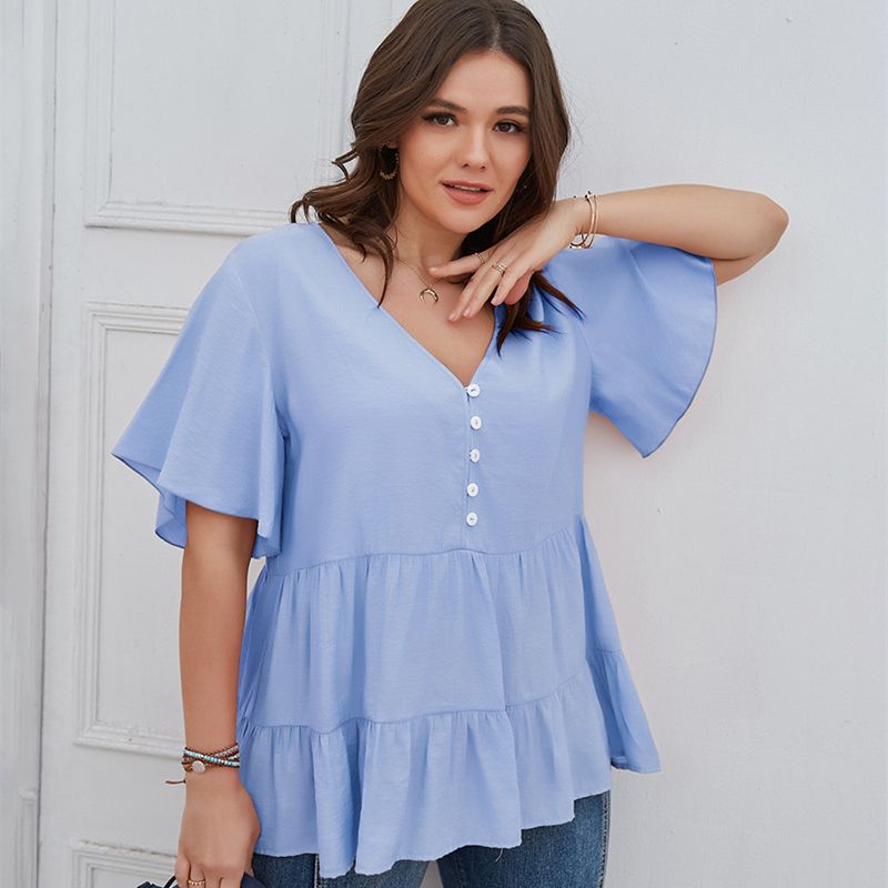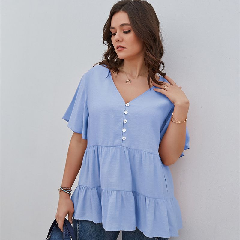 Size: XL, 2XL, 3XL, 4XL Model Size FYR: Height: 171cm, Bust:106cm, Waist:76cm, Hips:120cm, Model wear size XL ❤This is a v neck short sleeve big size tops plus size blouse !!❤Style:V Neck Short Sleeve Plus Size Blouse Big Size Tops. Please note that slight color difference should be acceptable due to the light and screen.What You Get:1 x Blouse. FQA:1. Q: Why the item haven't shipped out? A: After you place the order, We will ship the item to the rehmie warehouse within 48 hours as soon as possible, and then rehmie warehouse will send the item to you. If you find the logistics status is"to be shipped", it may be because the rehmie warehouse has not yet been shipped. Please don't worry. 2. Q: How can I choose the size? A:Please refer to the size chart and select the appropriate size according to your actual size.If you are not sure what size to choose, please call me. 3. Pls take note that all the clothes can not be returned or exchanged.4. All dimensions are measured by hand, there will be 2-3cm reasonable deviations. (1cm=0.39 inches). Pictures are only samples for reference. Due to the differences in monitor settings, the colors shown in the photograph may not correspond 100% to those in the items themselves. 5.For transportation needs, the cloth that you've received will have a fold phenomenon. Please don't worry, this fold situation will disappear after the first time you clear or ironing.