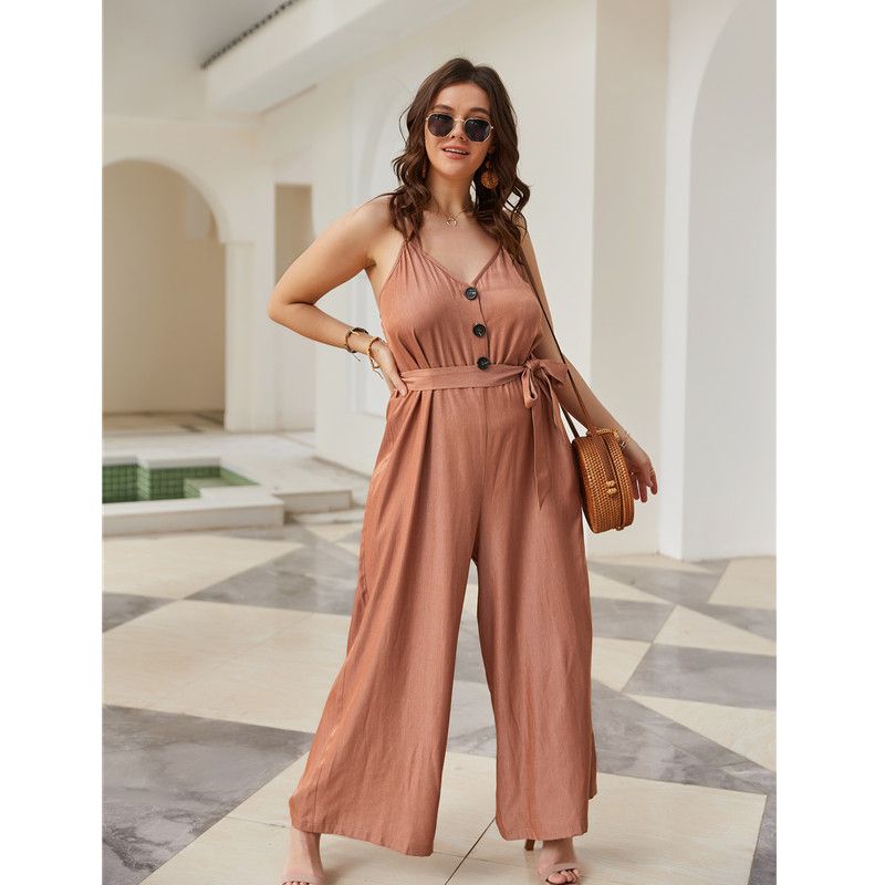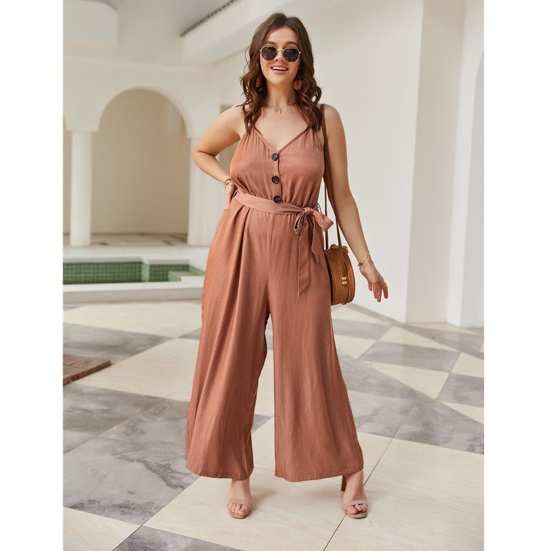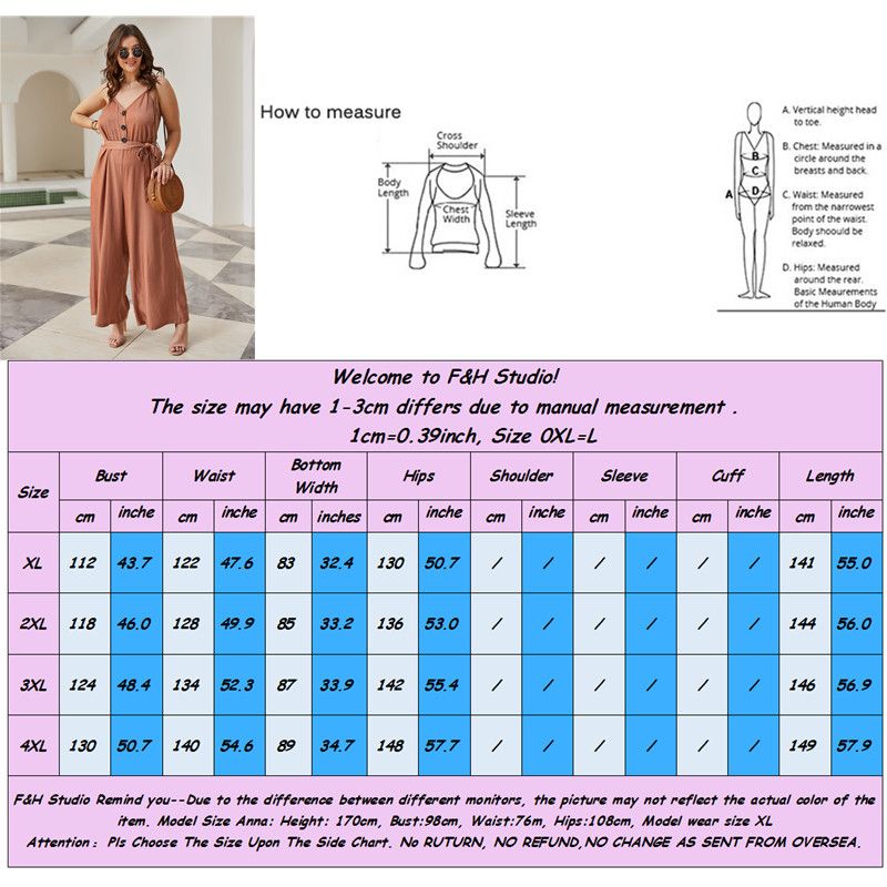 Size: XL, 2XL, 3XL, 4XL. Model Size FYR: Height: 171cm, Bust:106cm, Waist:76cm, Hips:120cm, Model wear size XL.❤This is v neck sleeveless jumpsuit !!❤Style: V Neck Sleeveless A-line Plus Size Jumpsuit Romper.Please note that slight color difference should be acceptable due to the light and screen.What You Get:1 x Jumpsuit. FQA:1. Q: Why the item haven't shipped out?A: After you place the order, We will ship the item to the rehmie warehouse within 48 hours as soon as possible, and then rehmie warehouse will send the item to you. If you find the logistics status is"to be shipped", it may be because the rehmie warehouse has not yet been shipped. Please don't worry.2. Q: How can I choose the size?A:Please refer to the size chart and select the appropriate size according to your actual size.If you are not sure what size to choose, please call me. 3. Pls take note that all the clothes can not be returned or exchanged.4. All dimensions are measured by hand, there will be 2-3cm reasonable deviations. (1cm=0.39 inches). Pictures are only samples for reference. Due to the differences in monitor settings, the colors shown in the photograph may not correspond 100% to those in the items themselves. 5.For transportation needs, the cloth that you've received will have a fold phenomenon. Please don't worry, this fold situation will disappear after the first time you clear or ironing.