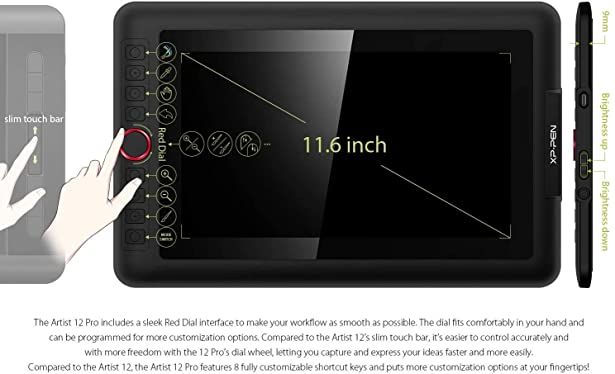 The Artist 12 Pro includes a sleek Red Dial interface to make your workflow as smooth as possible. The dial fits comfortably in your hand and can be programmed for more customization options. Compared to the Artist 12's slim touch bar, it's easier to control accurately and with more freedom with the 12 Pro's dial wheel, letting you capture and express your ideas faster and more easily.
