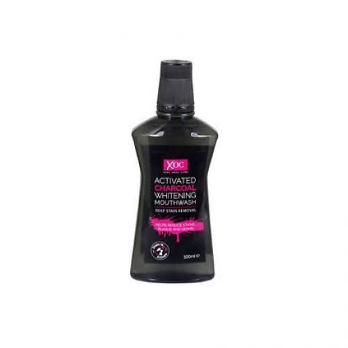 A bottle of Xoc Charcoal whitening mouthwash and toothpaste.