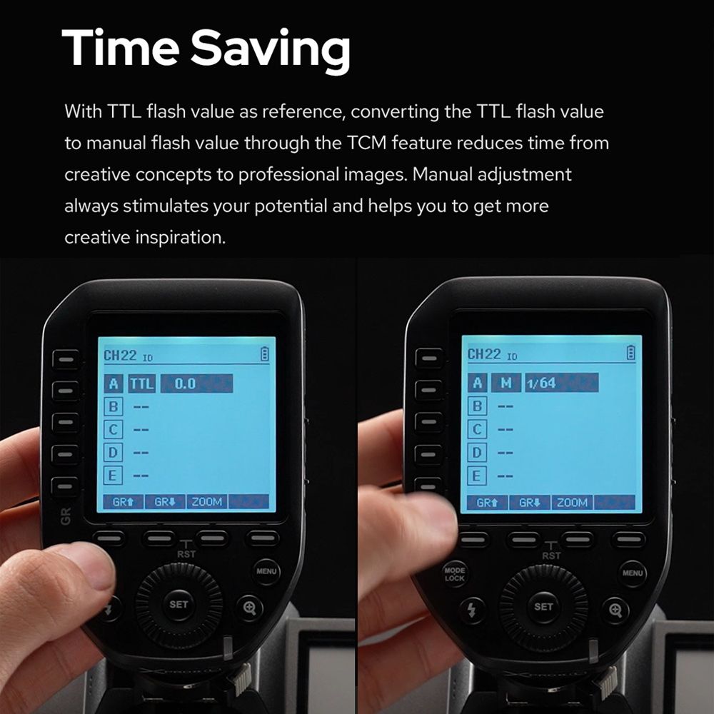 【Time Saving】With TTL flash value as reference, converting the TTL flash value to manual flash value through the TCM feature reduces time from unique concepts to professional images. Manual adjustment always stimulates your potential and helps you to get more inspiration.