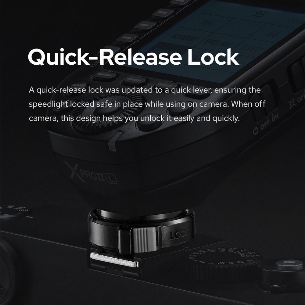 【Quick-Release Lock】A quick-release lock was updated to a quick lever, ensuring the speedlight locked safe in place while using on camera. When off camera, this design helps you unlock it easily and quickly.