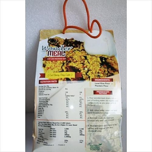 Wonder Meal is a natural organic meal just like pounded yam. It is made of local rice and plantain flour which is 100% organic.Nutritional Facts:Rich in - Carbohydrate - Protein