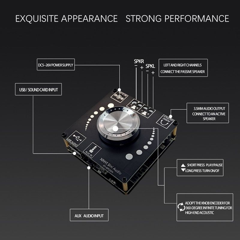 Maximum Power Per Channel: 100W Model Number: XY-AP100H Channels: 2 (2.0) Bluetooth: 5.0 colour:Black Material:plastic size:60 x 60 x 20mm Package Contents: 1 x Power amplifier board Only the above package content, other products are not included. Note: Light shooting and different displays may cause the color of the item in the picture a little different from the real thing. The measurement allowed error is +/- 1-3cm.