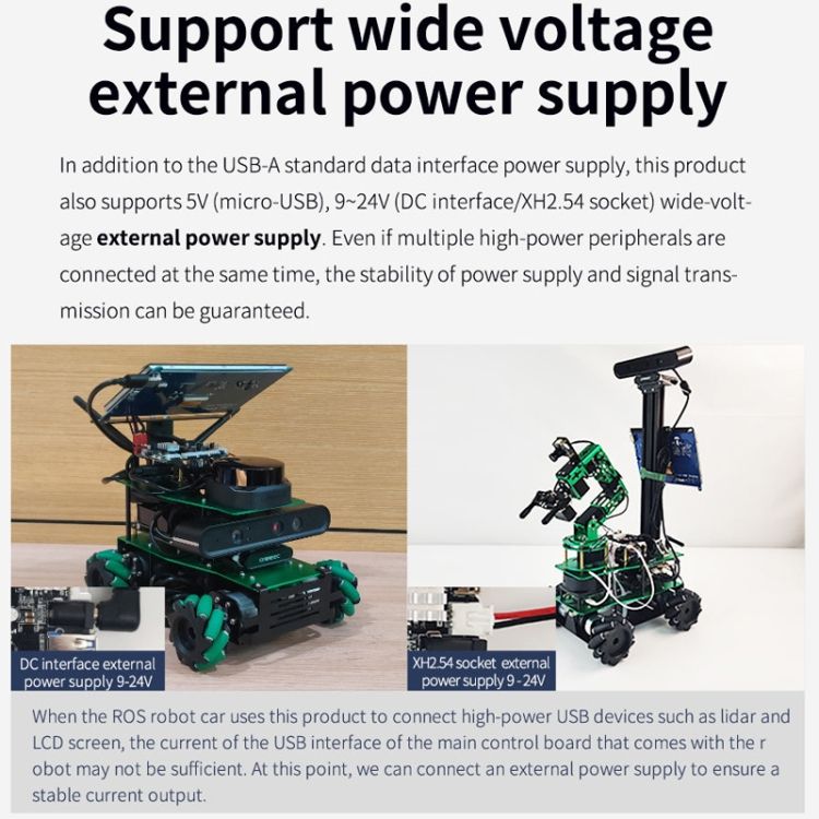 13. External power supply interface: microUSB (5V), DC5.5x2.5 (9V-24V), XH2.54 interface (9V-24V)