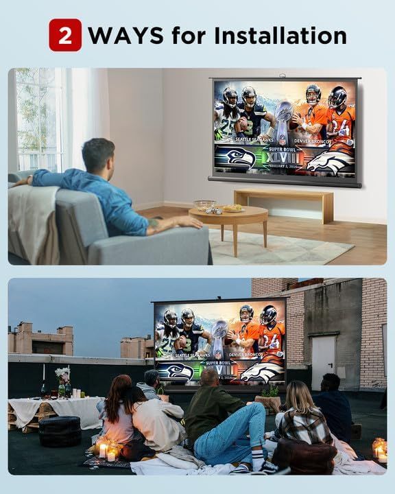 Indoor Outdoor projection movie screen is secured by convenient tight-straps, it could be carried to backyard or auditorium in a perfectly fitted projector screen bag, its retractable and adjustable design can be easily assembled in 3 steps
