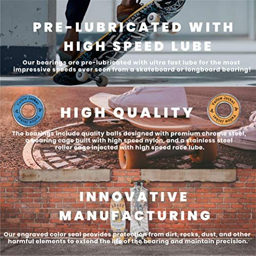 Details: Have you tried bearings that fall apart after just a few uses? Or found that you have to sarifie performane and durability for less expensive bearing brands? Well look no further beause more people hoose Yellow Jaket Bearings than any other beause they are durable, high performing, and most importantly easy on the wallet. Quality Balls designed with premium hrome steel for smooth gliding and optimal performane. Bearing age is built with high speed nylon for greater strength and less frition. The stainless steel roller age is injeted with high speed rae lube so the bearings are ready for use out of the box. Most rae bearings are pried extremely high but Yellow Jaket Bearings give you the rae performane you want for only a fration of the ost. These bearings have been tested up against all other big name brands and not only did they last longer but they glided further distanes at higher speeds. If you are looking for VALUE look no further than Yellow Jaket Bearings. Yellow Jaket Shield is designed to keep out all dust, roks, and partiles that will slow your bearings down over time. Its patented tehnology is unmathed and with the Yellow Jaket engraving everyone will know the bearings you are rolling!