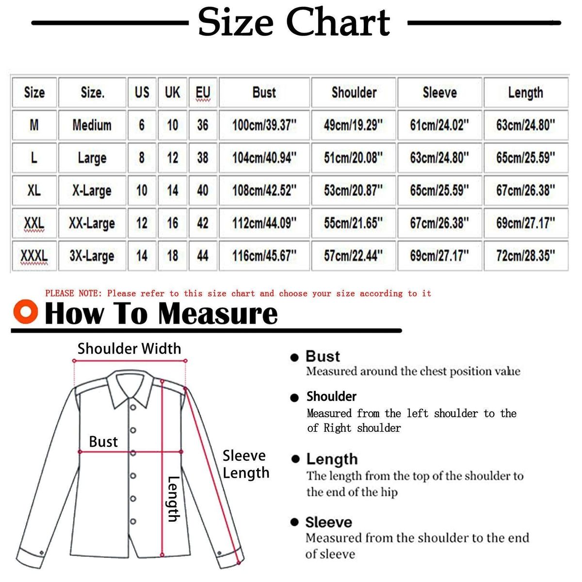 Size: XL Size.: X-Large US: 10 UK: 14 EU: 40 Bust: 108cm/42.52'' Shoulder: 53cm/20.87'' Sleeve: 65cm/25.59'' Length: 67cm/26.38''