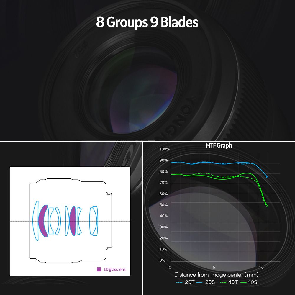 9 lens blades in 8 groups optical structure, including 2 ED glass lens, with multi-layer coating, the lens can effectively increase light transmittance, reducing dispersion, ghosting, and glaring.