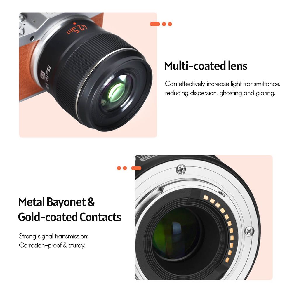 With metal bayonet and high-accuracy gold-plated contact, the lens is corrosive-proof and durable; auto focus and manual focus can be freely switched, also support full-time manual focus.