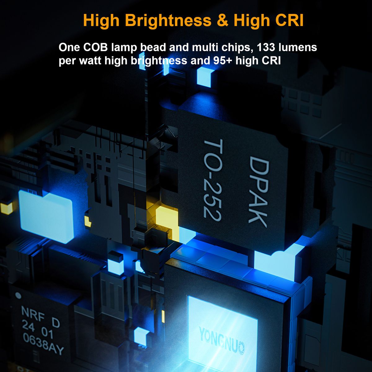 【YONGNUO Wireless Control System】With built-in YONGNUO 2.4G LED wireless control system, you can control the LED light from long distance up to 100M; also supports BT connection and APP wireless control, and the effective control distance is about 15M.