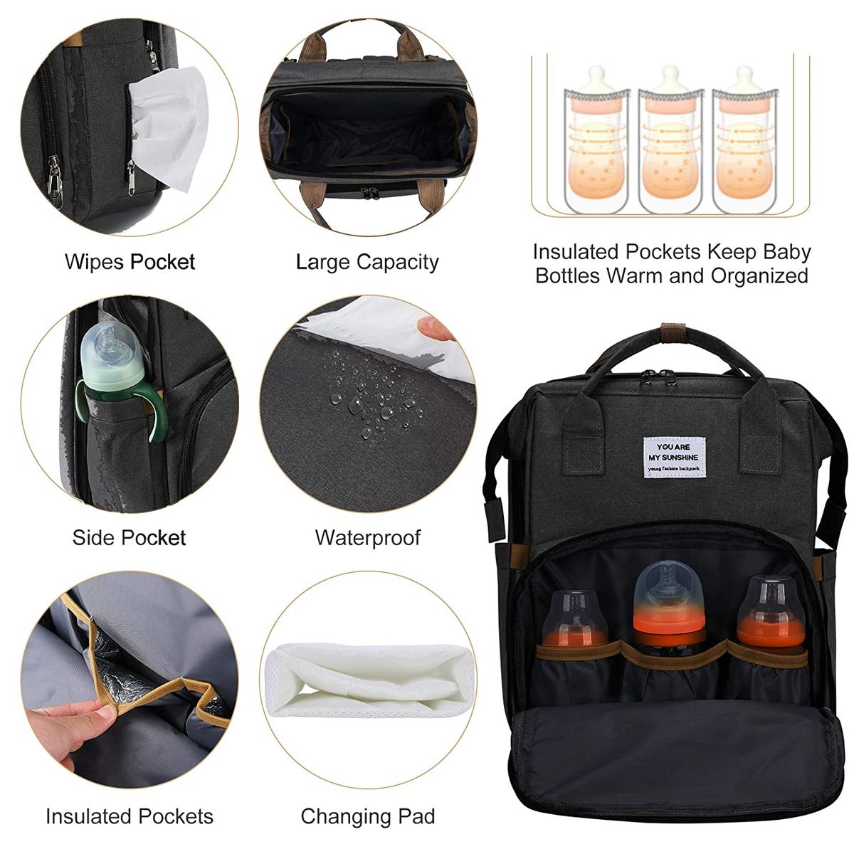 3-in-1 Multi-function Diaper Bag】 This baby bed bag diaper back pack with folding crib adopts a multi-pocket design, which not only increases the capacity, but also has a good barrier effect. You can put the baby bottle in the front three insulated pockets, which have aluminum foil insulation to ensure the baby can drink warm milk at any time, the side pockets can hold high-frequency use water bottles and wipes, and there is a pocket for laptop inside the multifunction baby nappy bag backpack.【Waterproof and Durable】 The outer layer of the waterproof travel backpack is made of high-grade polyester fiber, and the inner pocket is lined with waterproof material, which has high water resistance and dirt resistance, it's very easy to clean and quick-drying. Thickened shoulder straps and handles, reinforced stitching and lining, and strong zippers. Each crib diaper bag has been tested for tear resistance and load bearing, it's durable enough to last a long time.【Convenient and Ideal Gift】There are many ways to carry the portable Mummy diaper bag, you can use it as a backpack, handbag, and you can also hang it on a stroller. Whether you are shopping, camping or traveling, large capacity diaper bag backpack with travel foldable baby bed meet your different needs. The nappy change black diaper bag backpack is also a good gift for women.