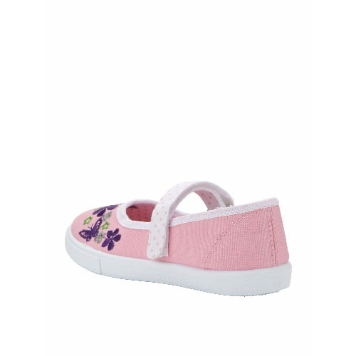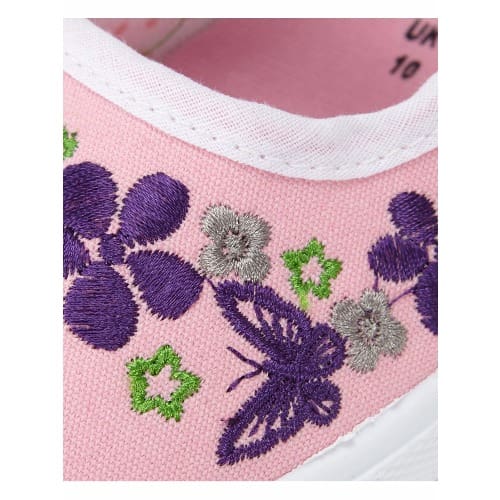 With a classic ballerina style and adjustable Mary-Jane strap, the plimsolls are cool and lightweight in a pink textile upper. The front is embroidered with pretty purple flowers and butterflies, while the strap and trims pop in contrasting spots for a sweet look. The white rubberised sole lends an athletic aesthetic, and is sturdy for outside strolls.