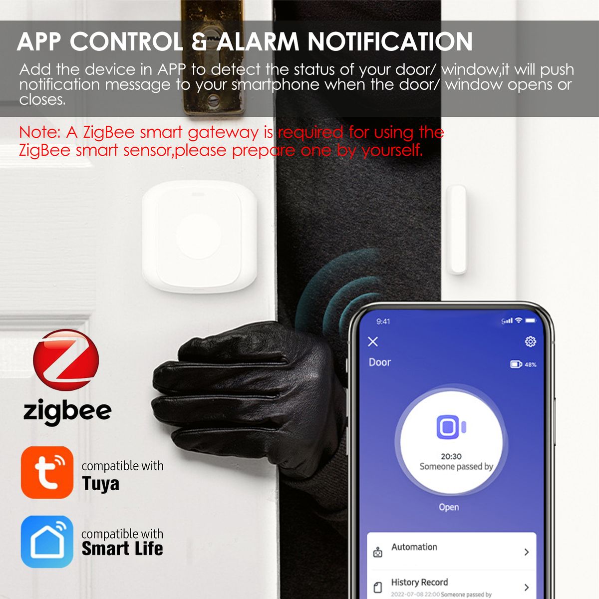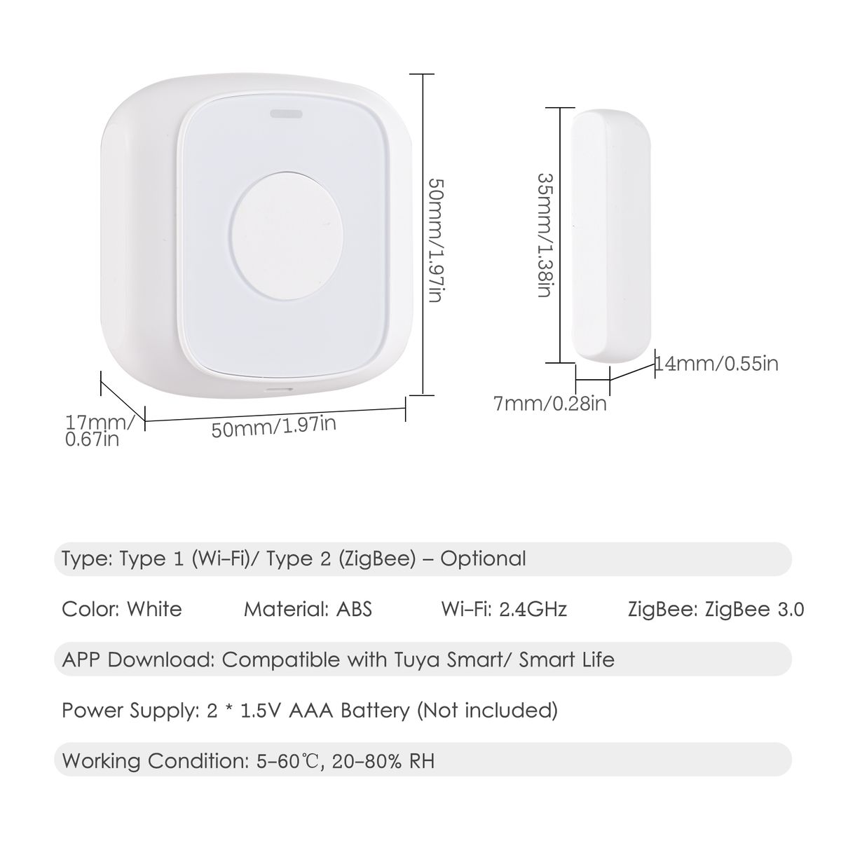 Smart Door Window Sensor, 2 Options: Wifi or ZigBee type. A ZigBee smart gateway is required for using the ZigBee smart sensor, please prepare one by yourself.