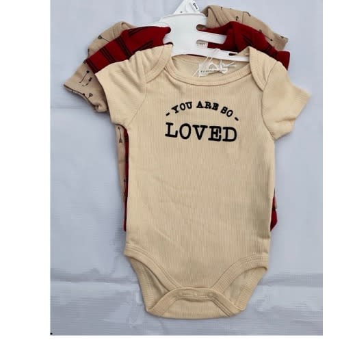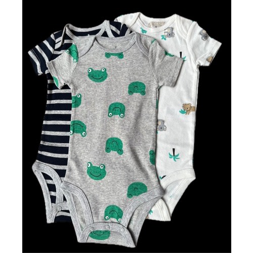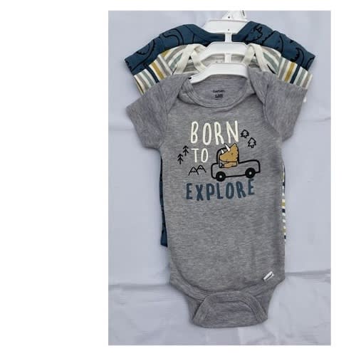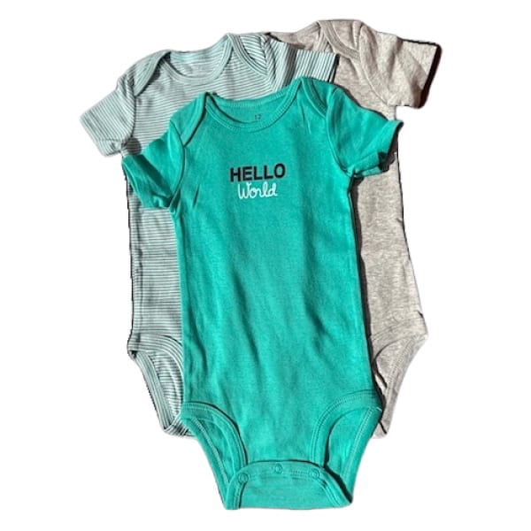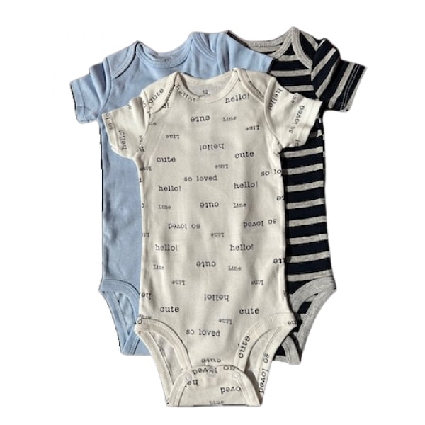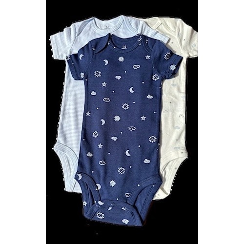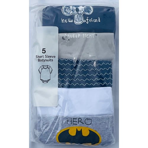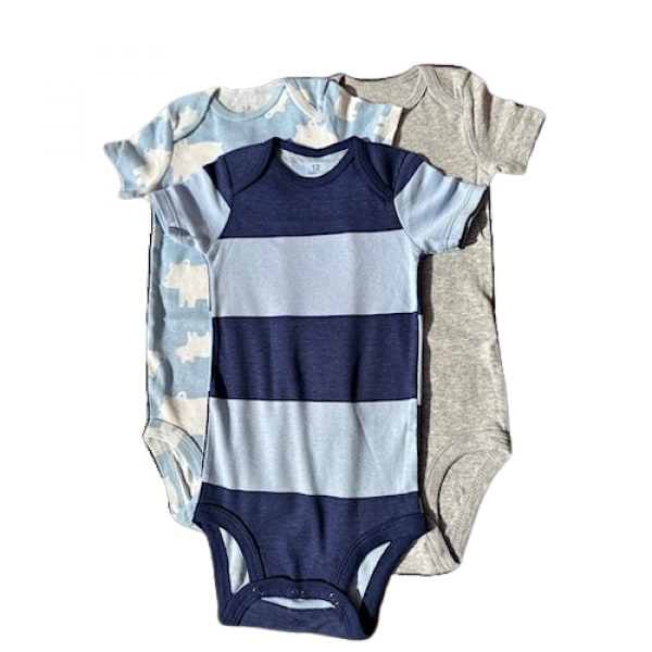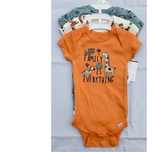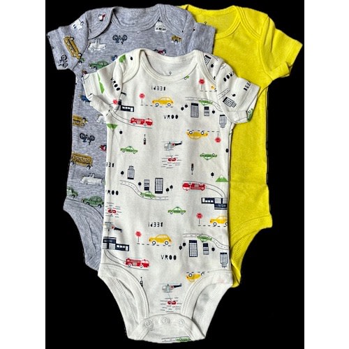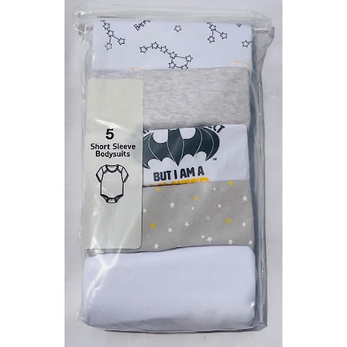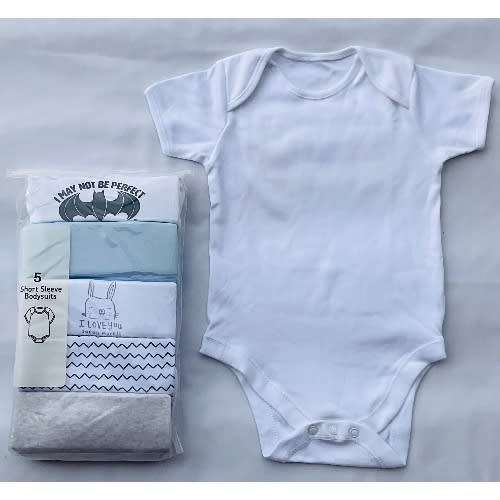 Bodysuits are made of 100% cotton for the softest touch on your baby's gentle skin. Bodysuits are essential to any baby's wardrobe, and these bodysuits are so comfortable that they can be used as underwear or even on their own. Assorted with printed designs, sayings, and prints; available in boy and girl designs and fits up to 12 month