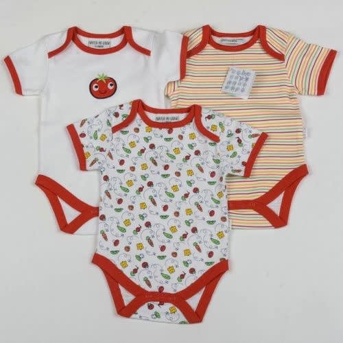 This set of 3 Veggie Baby Bodysuits will give your little one a comfortable night & rsquo;s sleep. They are made from 100% cotton and have a popper fastening. For extra style, each bodysuit has a cute little veggie design, one with tomato applique, one with all over design.