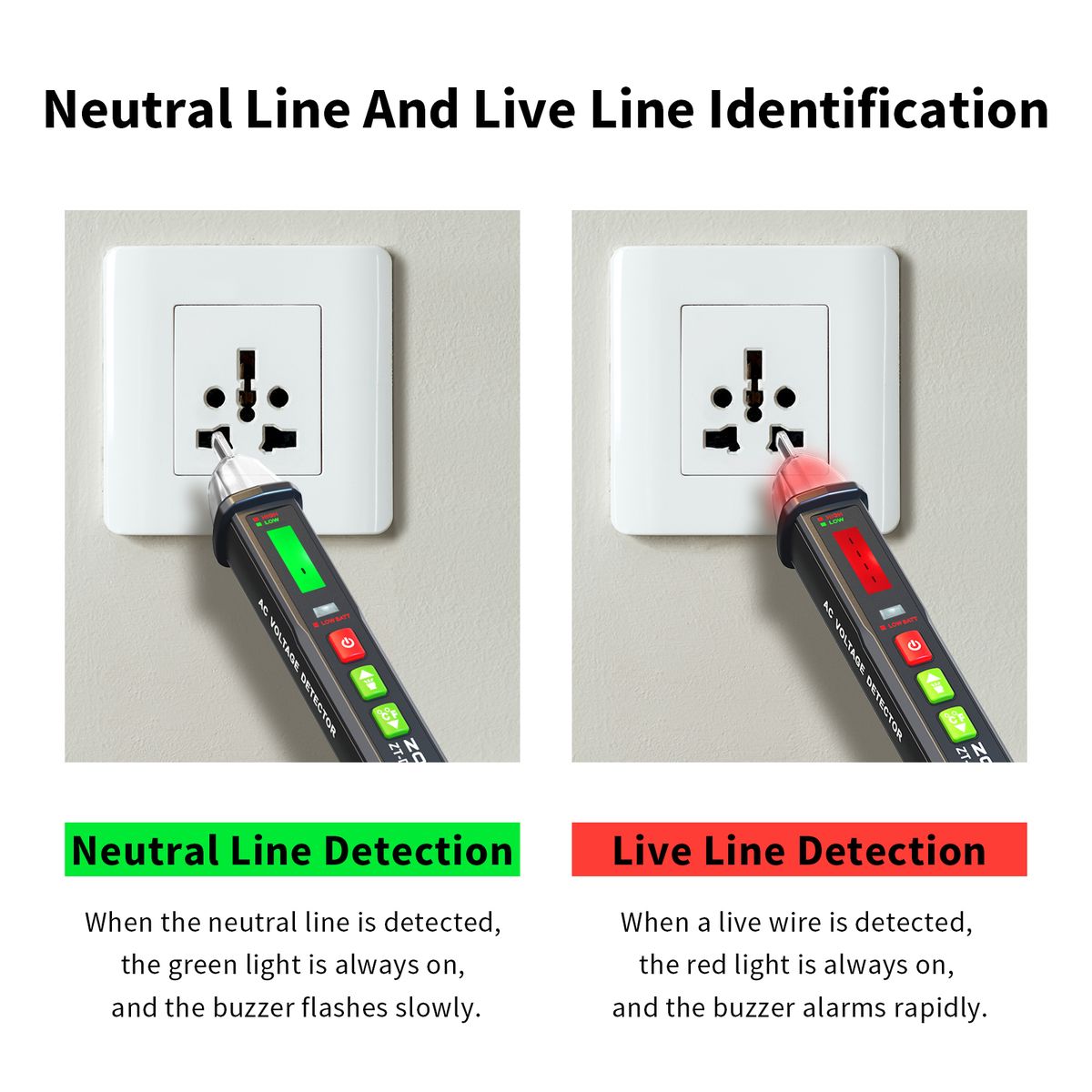 [Non-contact measurement]AC voltage NCV induction probe, put the probe end close to the power supply and voltage, if the distance is closer, the frequency of flashing red lights will be higher, and there will be a high-frequency beeping sound, which means that there is voltage, The live tester automatically detects live or neutral, is ideal for break-point testing.It is a convenient circuit tester for electricians and homeowners.